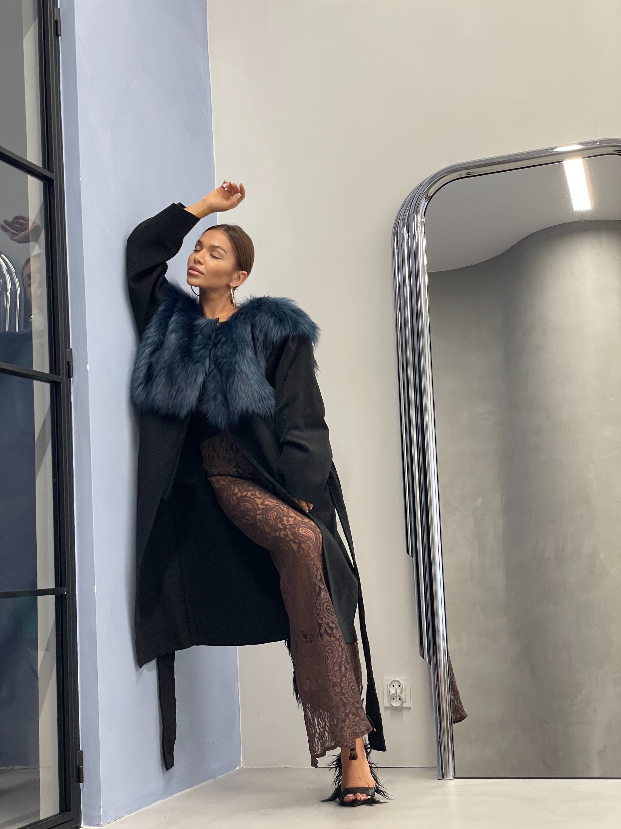 BLUE FAUX FUR ON TOP, RAW EDGES,